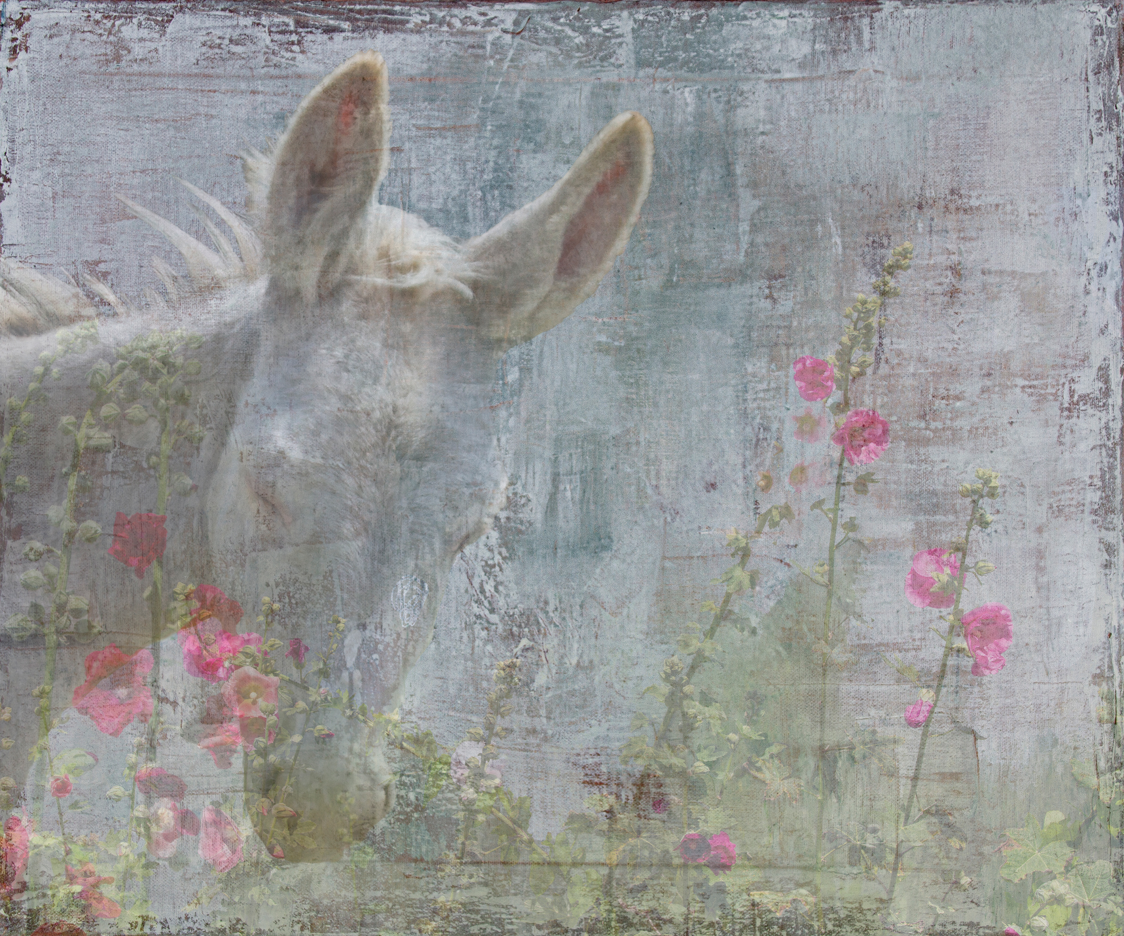 Donkey in hollyhock field
